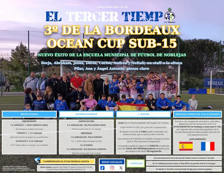 El equipo Sub-15 del C.D. Noblejas ha cerrado su participación en la Bordeaux Ocean Cup con un magnífico tercer puesto, culminando un fin de semana inolvidable de fútbol, convivencia y experiencia internacional tras imponerse en el partido por el tercer y cuarto puesto al conjunto de Aiglon du Lamentin en la tanda de penaltis.