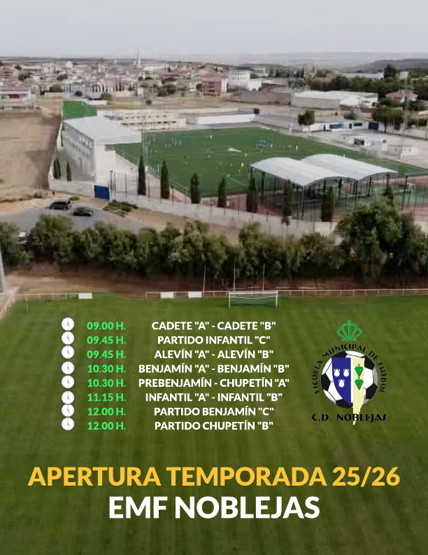 Este sábado se celebrará la Jornada de Apertura de la Temporada 2025/26 en la Escuela Municipal de Fútbol de Noblejas, un evento muy especial en el que todos los equipos de la Escuela volverán a reunirse para dar comienzo a un nuevo curso cargado de ilusión.